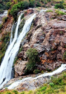 The two streams gather momentum on their downward flow and cascade down a huge cliff from about 98 m high. The Gaganachukki Falls are situated towards the western part of the cliff, whereas the Bharachukki Falls lie towards the eastern part.